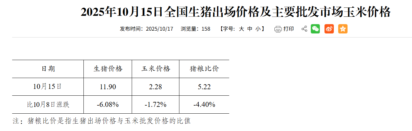 2025年10月15日猪粮比:生猪价格及玉米批发价格
