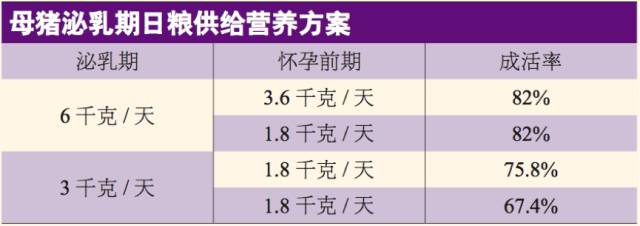 从下图可以看出,采食量不够会对成活率造成较大影响,我们可以依此公式计算哺乳母猪的采食量需求:哺乳母猪总代谢能需要=[(仔猪日增重×哺乳仔猪数×4.92)-(90×哺乳仔猪数)]/0.72+106×BW0.75