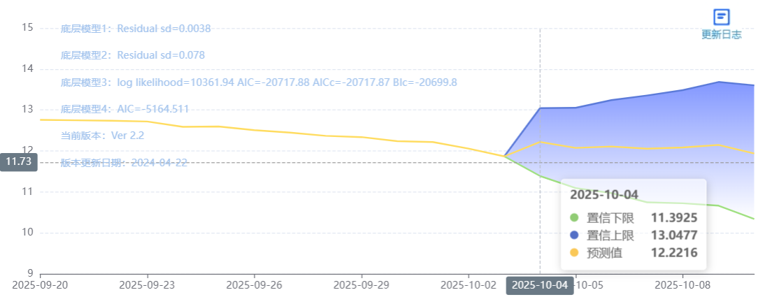 玄田算法是由项目课题组团队原创的非经典逻辑数值聚合理论和不确定性预测方法,构建了基于一致模算子的生猪价格预测模型。该模型采用的聚合函数及一致模相关理论与方法已获得多项国家自然科学基金和省级自然科学资金资助,并获得多项省级自然科学奖奖项。10月04日预测猪价为12.2216,置信区间在11.3925--13.0477之间。10月05日预测猪价为12.0770;10月06日预测猪价为12.1099。
