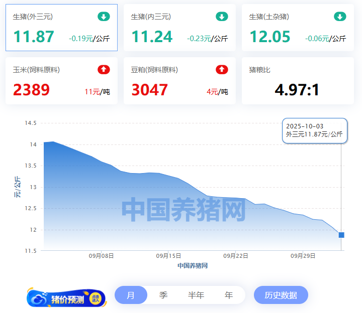 2025年10月03日(星期五),中国养猪网猪价系统数据监测如下:生猪(品种:外三元)均价为11.87元/公斤(5.935元/斤),价格较昨日下跌了0.19元/公斤(0.095元/斤);猪价环比下跌15.58%,同比下跌34.06%。