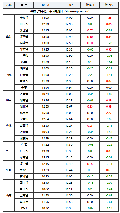 2025年10月03日-中国养猪网生猪(外三元)均价涨跌表