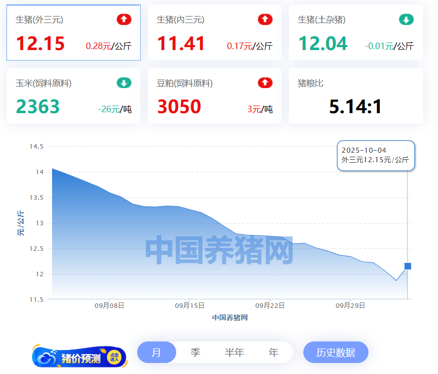 2025年10月04日中国养猪网生猪(外三元)均价走势图