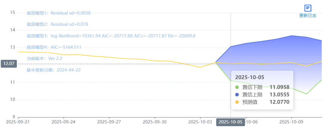 玄田算法是由项目课题组团队原创的非经典逻辑数值聚合理论和不确定性预测方法,构建了基于一致模算子的生猪价格预测模型。该模型采用的聚合函数及一致模相关理论与方法已获得多项国家自然科学基金和省级自然科学资金资助,并获得多项省级自然科学奖奖项。10月05日预测猪价为12.0770,置信区间在11.0958--13.0555之间。10月06日预测猪价为12.1099;10月07日预测猪价为12.0564。