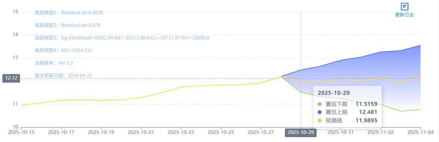 玄田算法是由项目课题组团队原创的非经典逻辑数值聚合理论和不确定性预测方法,构建了基于一致模算子的生猪价格预测模型。该模型采用的聚合函数及一致模相关理论与方法已获得多项国家自然科学基金和省级自然科学资金资助,并获得多项省级自然科学奖奖项。10月29日预测猪价为11.9895,置信区间在11.5159--12.481之间。10月30日预测猪价为11.9693;10月31日预测猪价为12.0608。