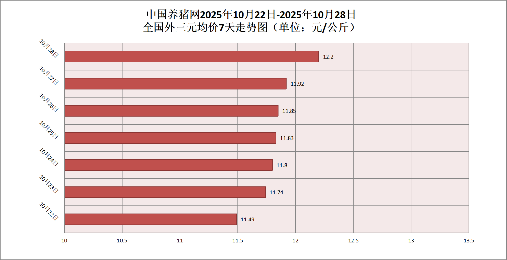 2025年10月28日(星期二),据中国养猪网猪价系统监测,全国外三元均价为12.20元/公斤,猪价较昨日(11.92元/公斤)上涨了0.28元/公斤,较上月(12.37元/公斤)下跌了0.17元/公斤。